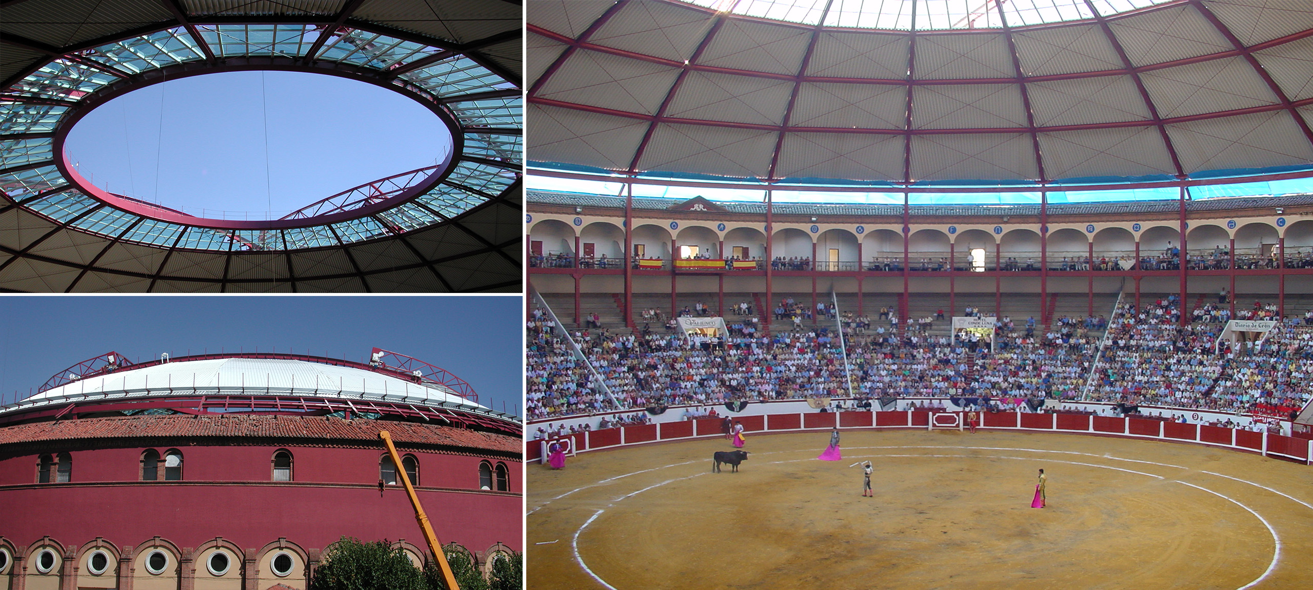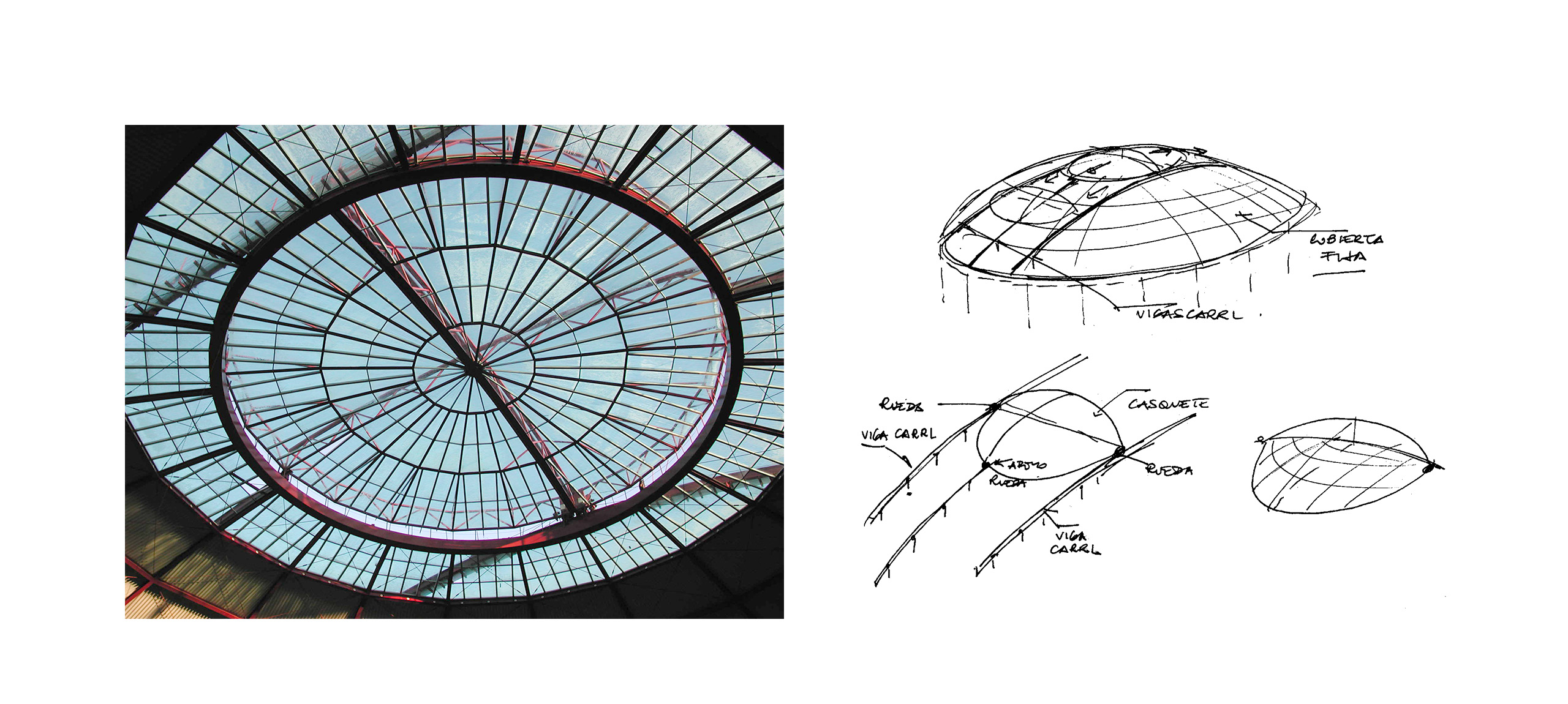 The single-layer fixed roof is a Schwelder-type dome composed of IPC commercial steel profiles (parallels, meridians and diagonals) with a 1/8 rise-span ratio. It is supported on steel pillars at its perimeter.