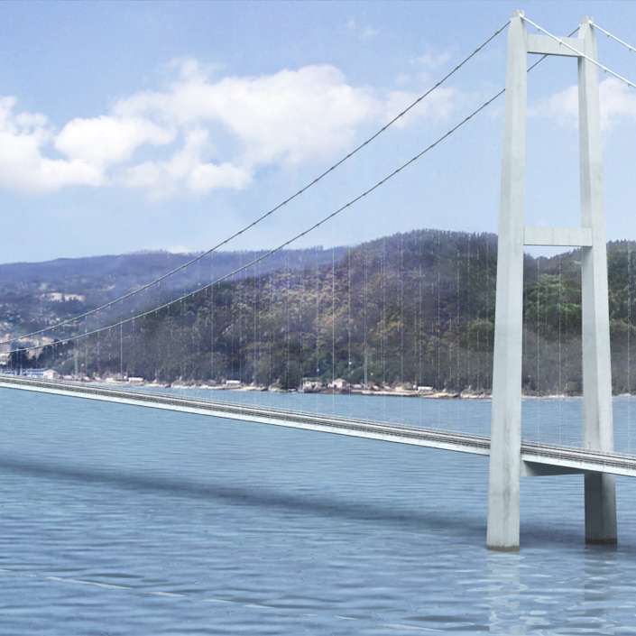 The bridge will connect the City of Vigo with the Morrazo Peninsula with the aim to alleviate the already saturated traffic network in the area especially the Rande bridge. It will begin in the southern area of the duty-free area of Vigo Port and will end up on the Northern Side near Punta Rodeira on the Mozzara Peninsula. The proposed structural solution is a 2,700m long suspension bridge, with a 1,500m central span which will allow current sea traffic maneuvers with a horizontal clearance of around 300m and a free height clearance greater than 50m. The transversal cross-section employed in this solution is 43.0m wide which accommodates a 3-lane motorway and two tracks for a light railway which imposes a 4% longitudinal slope limitation on the deck.
