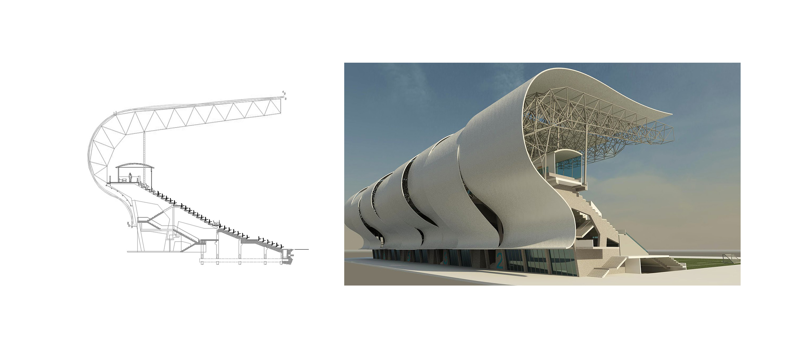 After the success remodelling of the grandstand “North”, the remodeling of the grandstand “River” is proceeded. In this case, the 3D steel structure is poorly conserved, so the remodelling project proposes its replacement. As in the grandstand “North”, the new roof supports the architectural skin that extends through the façade. Although the dimensions of the new roof and the points of support in the concrete frames are similar to those of the existing roof, the fact of closing the roof modifies the wind exposure.