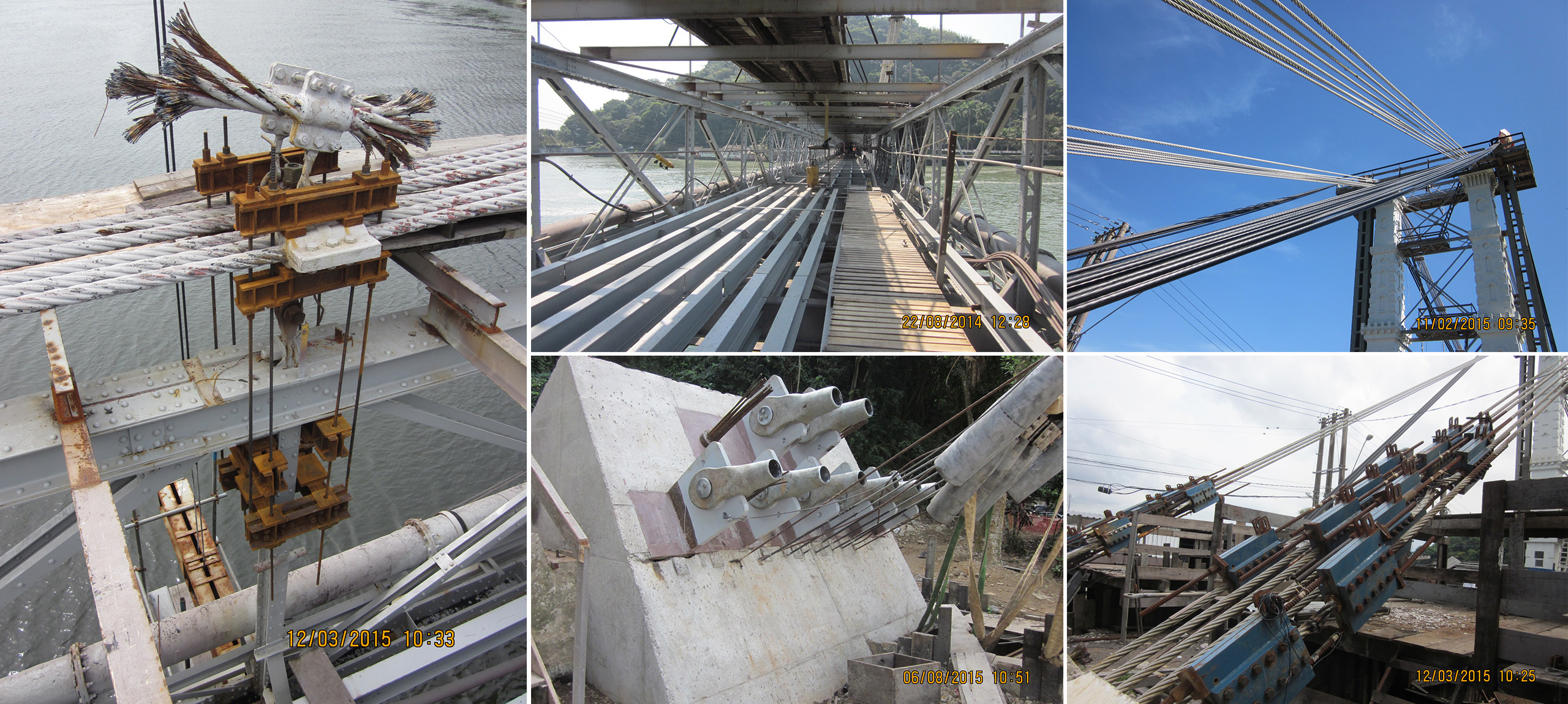 The São Vicente Suspension Bridge was erected in 1914 as part of the sanitation plan of the Santos and São Vicente area. Bridge condition in 2012 was deemed to be critical as some elements in trusses had disappeared and cable shown important corrosion and loss of cross section.