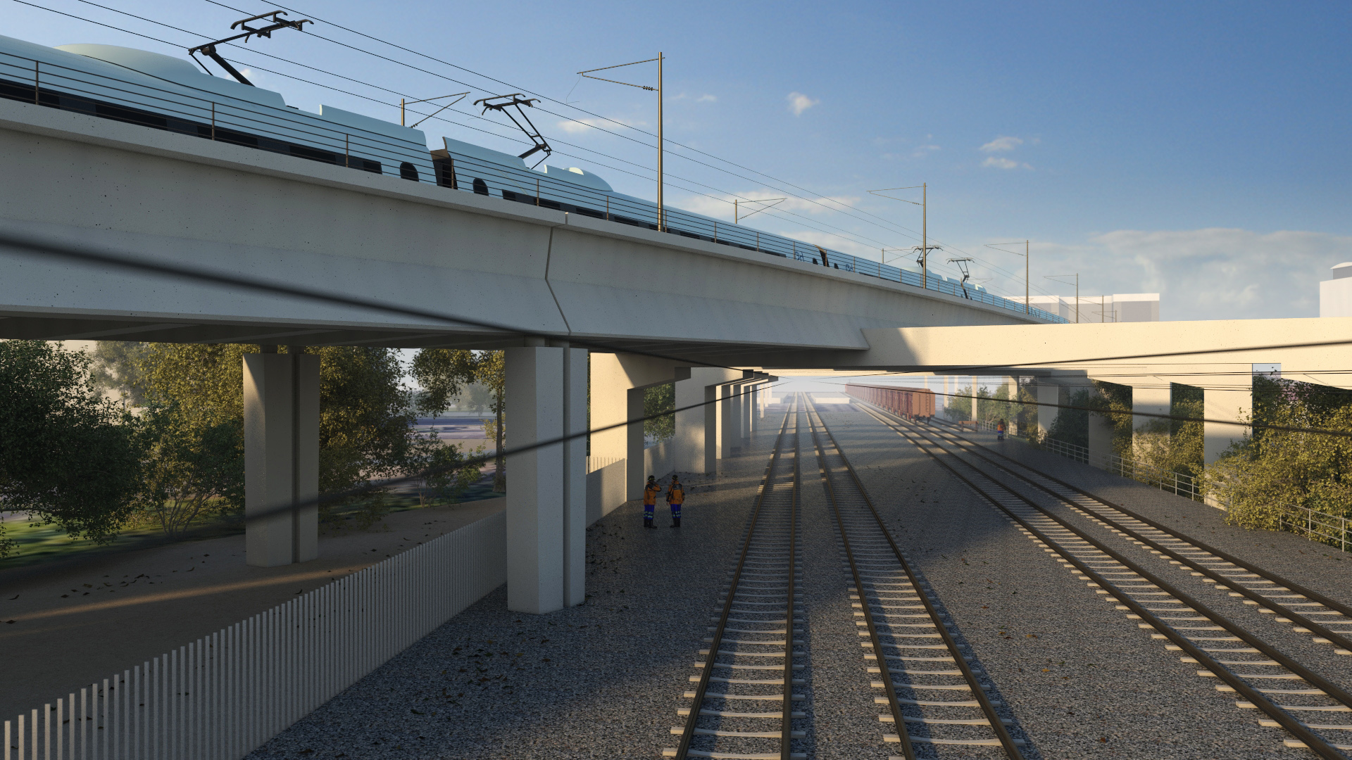 Proposal to replace the existing viaduct over the East West railway line in the UK. The objective is to replace a viaduct that is 60 years old with a total of 30 spans and approximately 600 m in length that crosses over the track bed. The proposal consists of using a prefabricated modular solution, consisting of a "U" section, that allows maintaining or even improving the existing clearance, that can be adapted to different spans and types of piers, and that allows integrating the structure with the platforms of the future station expansion.