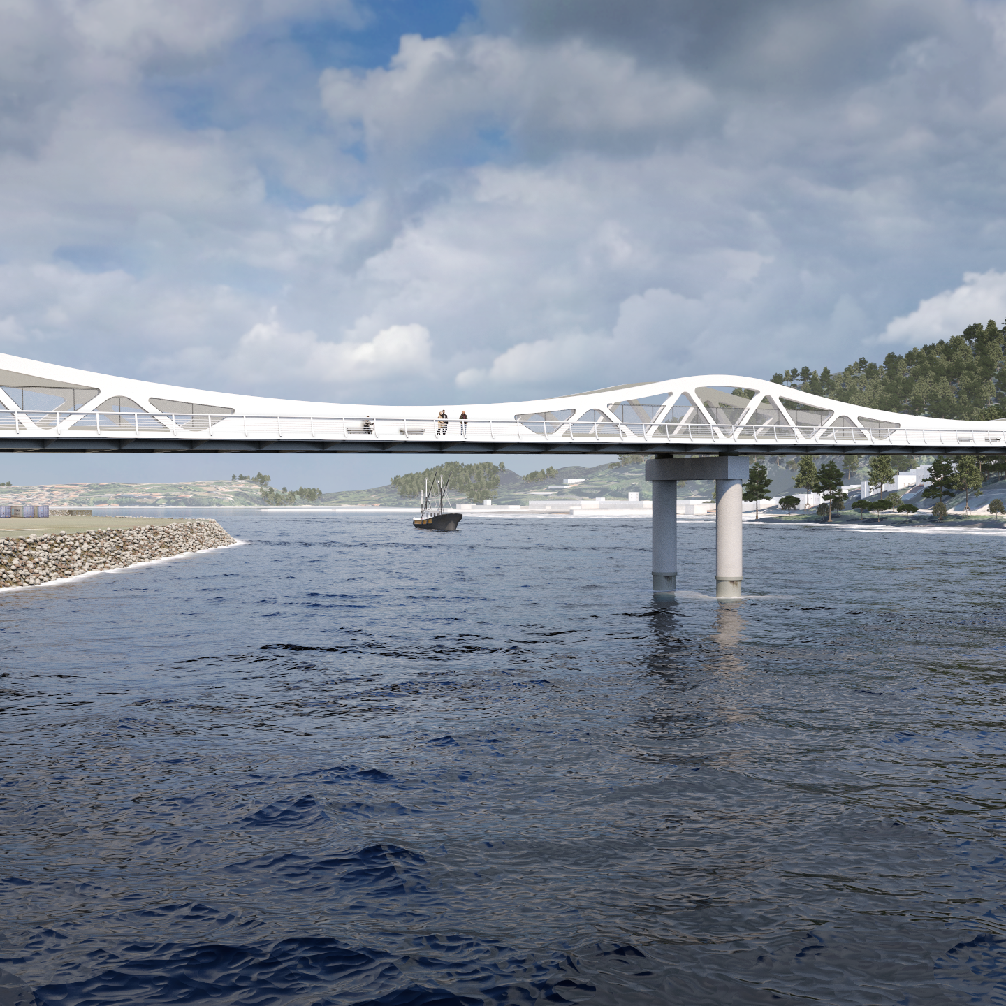 - The second section, 396 meters long, located between pier 11 and abutment 2, is the steel bridge that crosses the inlet. It consists of a double continuous truss with a variable depth and a lower deck, designed and engineered by Fhecor.